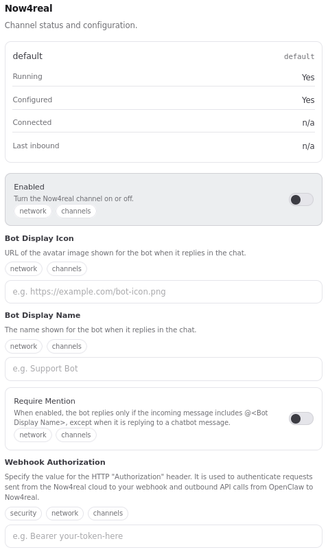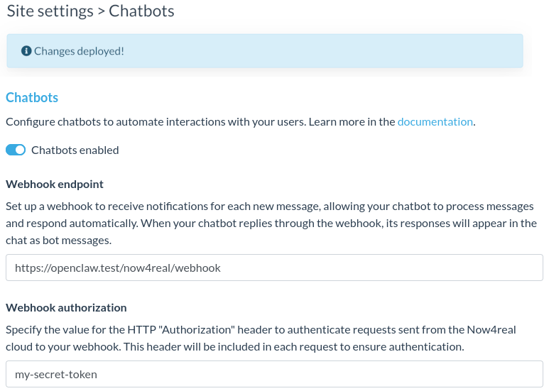 - Enable the chatbot and paste your OpenClaw webhook public URL (e.g., https://your-openclaw-gateway.test/now4real/webhook).