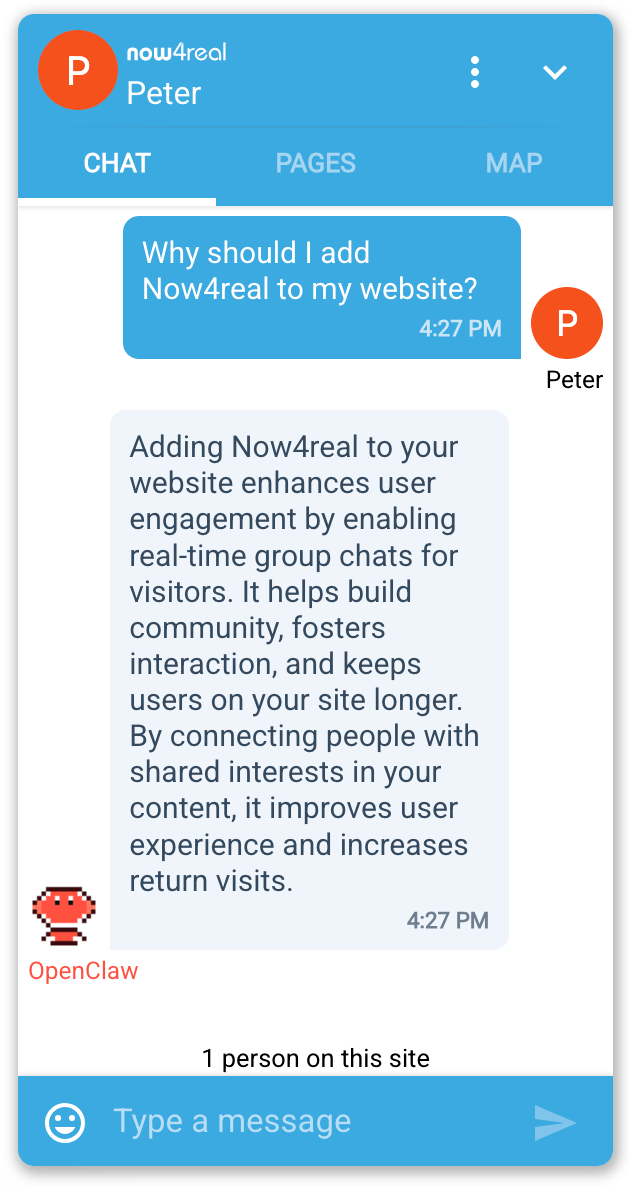 The synergy between OpenClaw and Now4real turns your static pages into a dynamic hub of information and community. By bringing a powerful, customized AI agent directly into the conversation, you provide instant value to your visitors exactly when they need it.